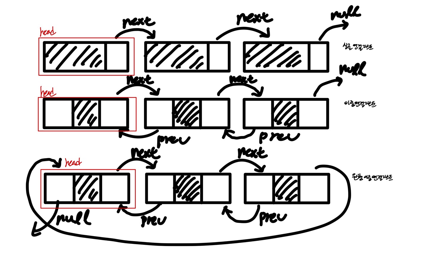 싱글 연결 리스트는 next 포인터만을 이중 연결 리스트는 next 포인터와 prev포인터를 원형 이중 연결 리스트는 마지막 노드의 next 포인터가 헤드 노드(맨 앞에 있는 노드)를 가리키는 것을 의미한다.