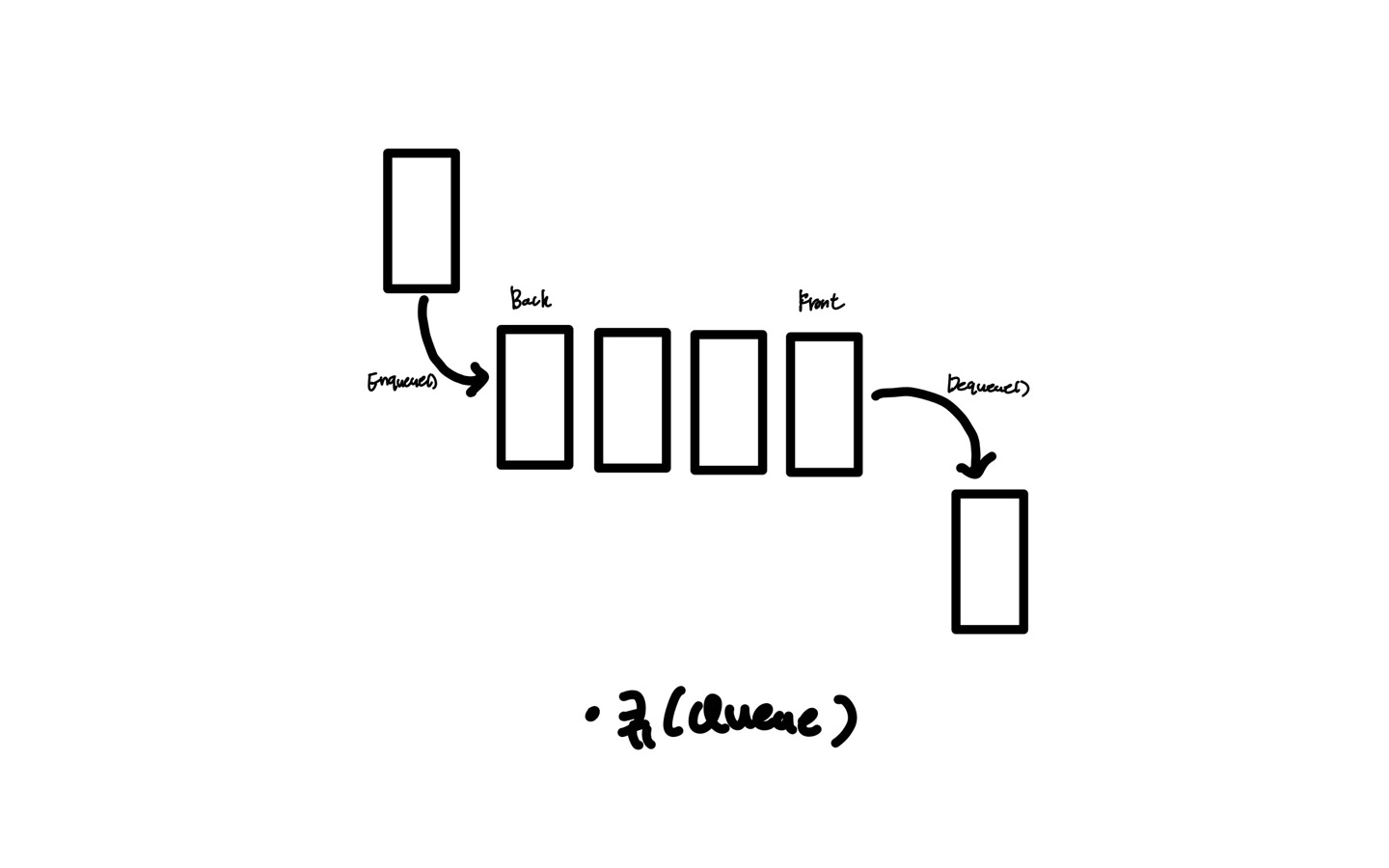 큐(Queue)는 먼저 집어넣은 데이터가 먼저 나오는 성질(FIFO, First In First Out)을 지닌 자료구조이다. 나중에 집어넣은 데이터가 먼저 나오는 스택과는 반대되는 개념을 가졌다. 시간 복잡도로는 삽임 및 삭제에서 O(1)과 탐색에서는 O(n)이 걸린다. CPU 작업을 기다리는 프로세스나 스레드 행렬 또는 네트워크 접속을 기다리는 행렬, 너비 우선 탐색, 캐시 등에서 사용된다.